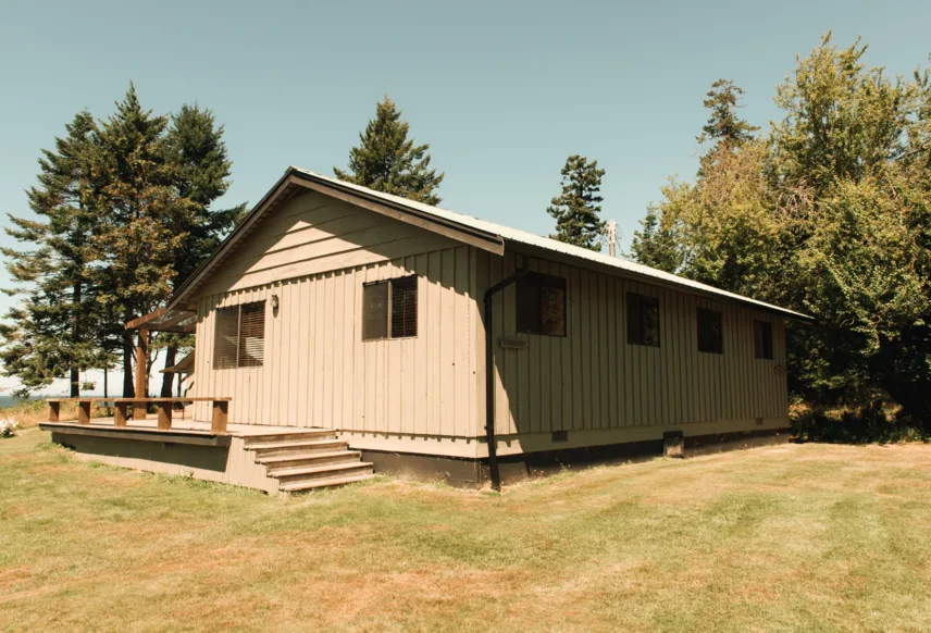 Set slightly back from the cliffside, this lovely two-bedroom cottage overlooks our flower garden and the Salish Sea. With a queen bed in the primary bedroom, two twins in the secondary and a full-kitchen, this cabin is well suited for a family. Arbutus and Balsam are side-by-side with a shared patio, making them great for larger groups.