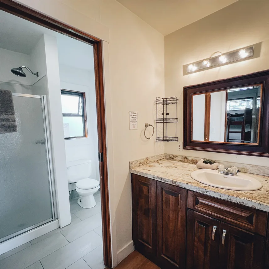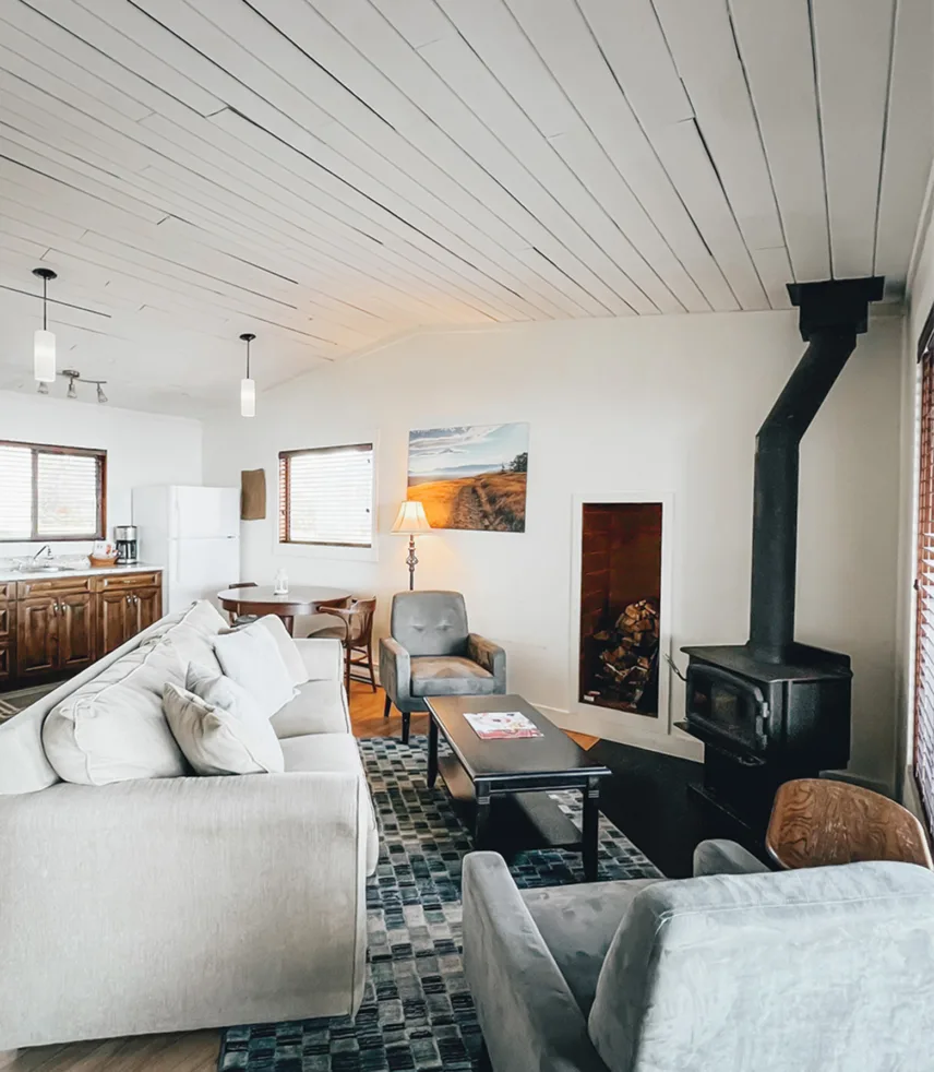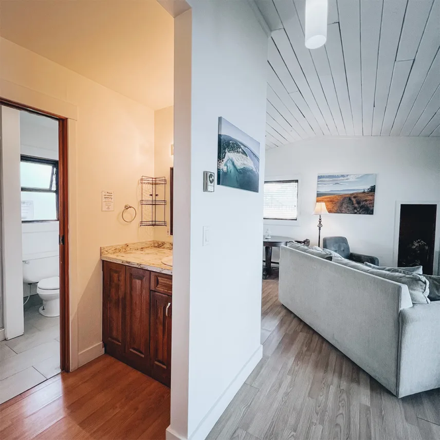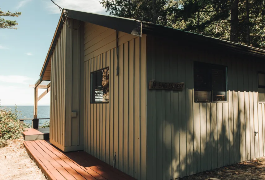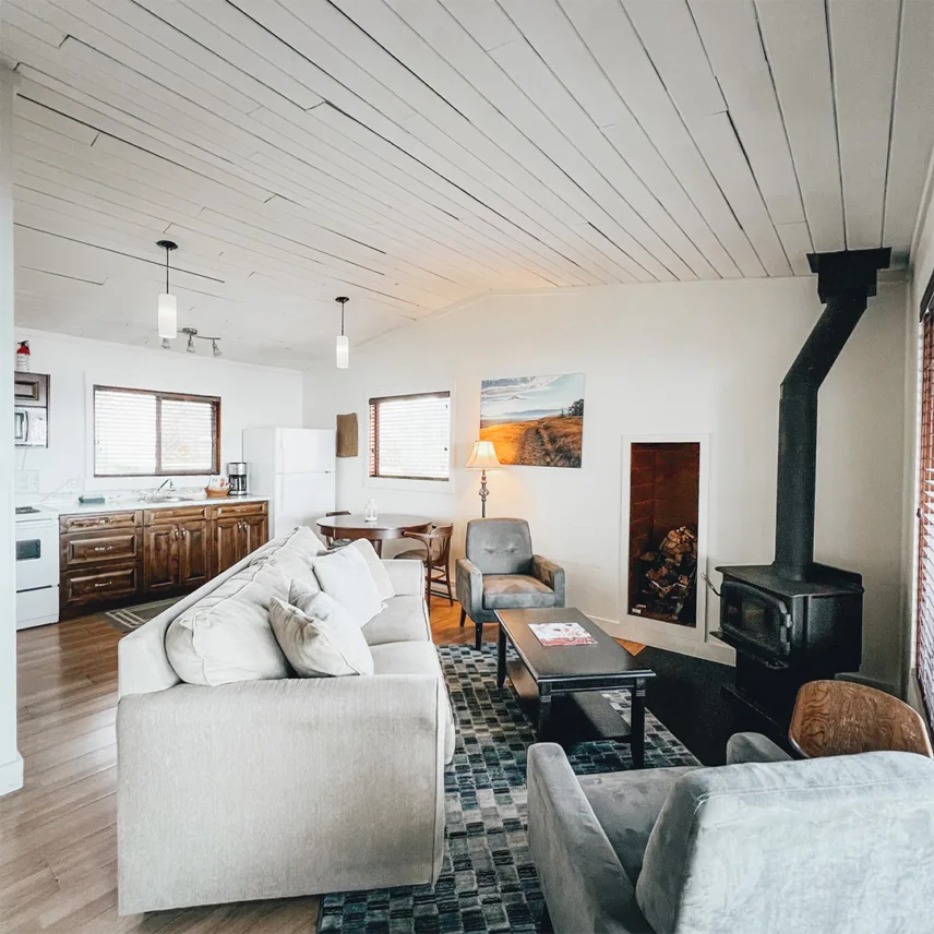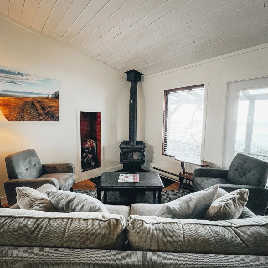 Located on the far side of the property, this large two-bedroom cottage is incredibly private and features an open-concept kitchen/dining area, a wood-burning fireplace and ocean views from the living room and patio. The primary bedroom also boasts spectacular ocean views from the queen bed while the secondary bedroom houses a set of bunk beds (two twins) and a third twin, making this cabin ideal for families with youngsters.
