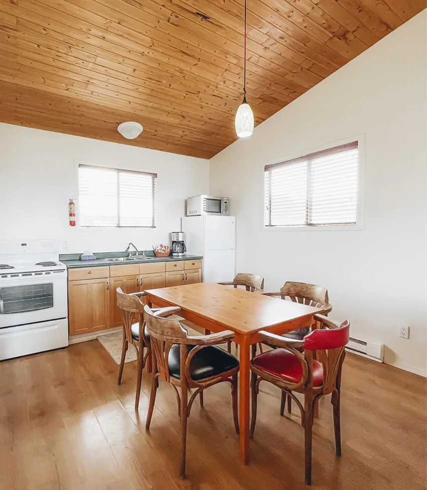 True to its name, Regal Suite is our largest cottage on the property and features two bedrooms, a spacious living area, an open-concept kitchen and dining area, a wood-burning fireplace and a lovely waterfront deck. The primary bedroom boasts spectacular ocean views from the queen bed while the secondary bedroom houses a set of bunk beds (1 double, 1 twin) and a second twin. With extra square footage, Regal Suite is perfect for a large family or two couples.