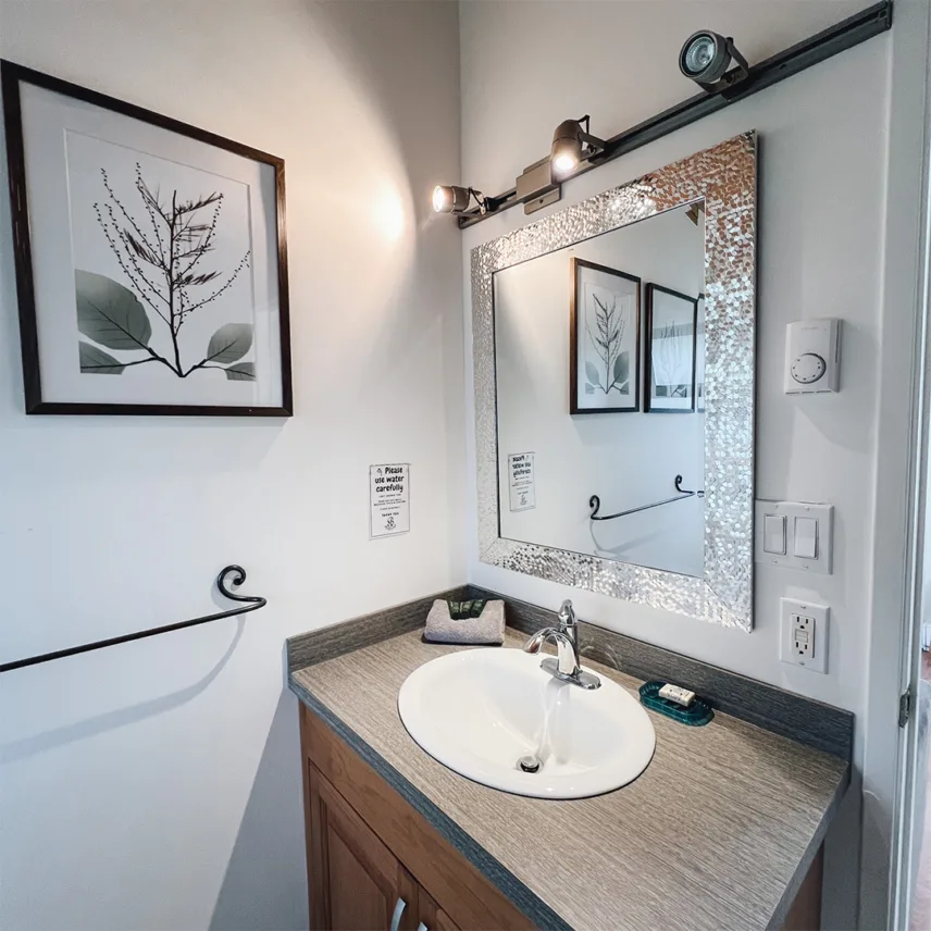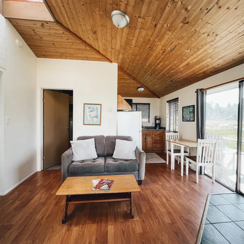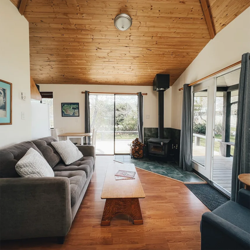 Named after Sea Breeze’s most loyal and long-term guests, Watt’s Inn features a queen bed in the primary bedroom, a set of bunk beds (two twins) and a double bed in the secondary bedroom, a full-kitchen, a wood-burning fireplace and a large wrap-around private patio. Boasting the sunniest location on the property, this two-bedroom is perfect for soaking up the sunshine and gazing out at the lovely garden. With a double bed in the secondary bedroom, this cabin is ideal for two couples traveling together or larger families.